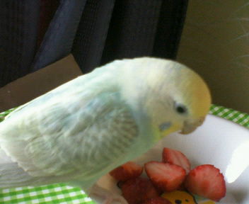 デザートには苺!よーく考えると贅沢なインコです。